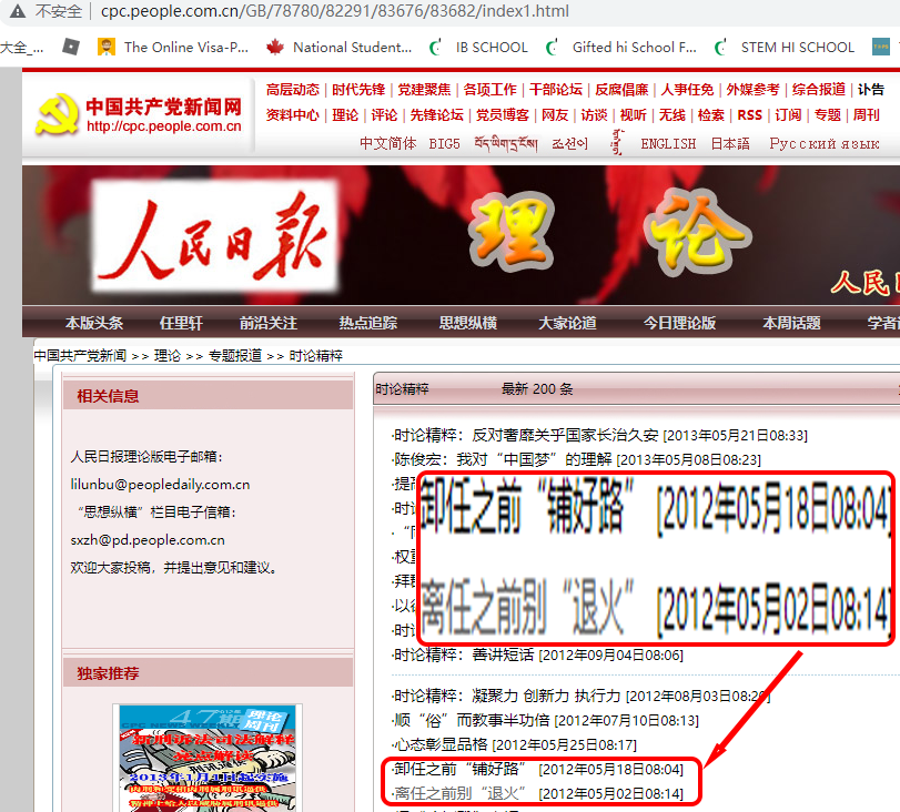 On 18 May 2012, the People’s Daily published an editorial entitled “Finish the paving way before leaving office”. For the third time, it publicly put pressure on the Hu Jintao clique and also launched a challenge to the Jiang Zemin clique. |